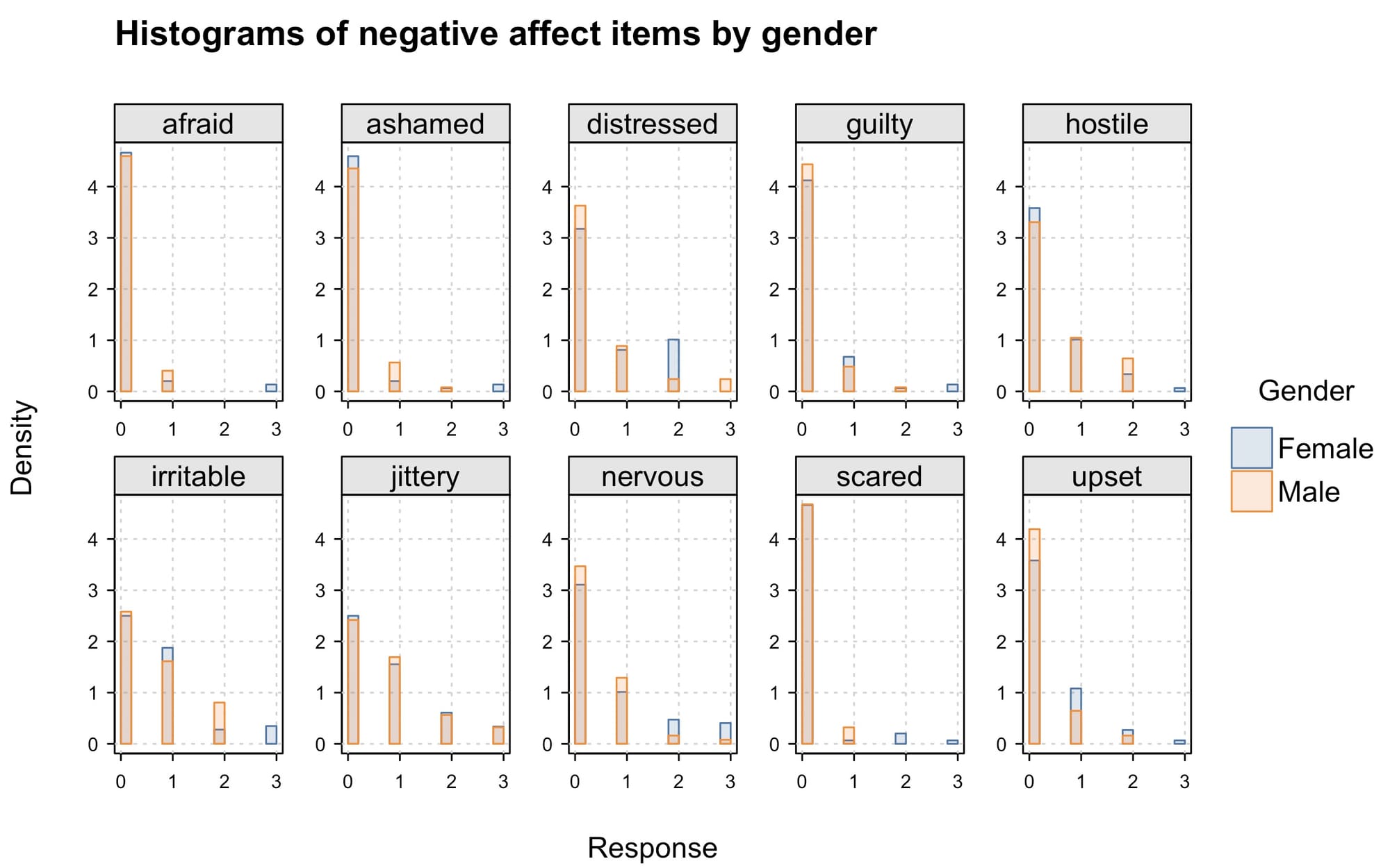 main = "Histograms of negative affect items by gender",