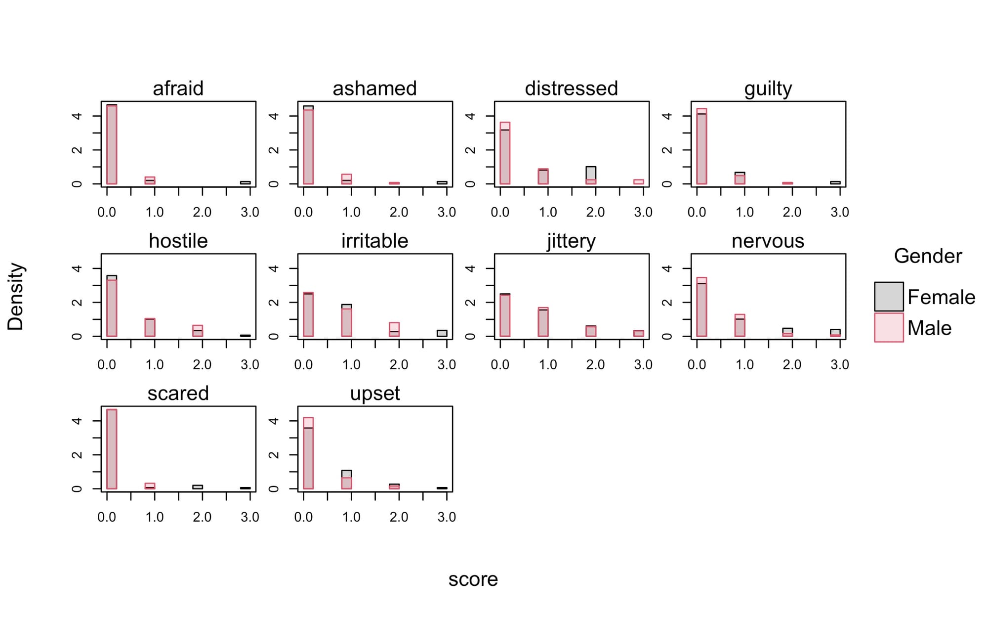 irritable, jittery, nervous, scared, upset, gender)]